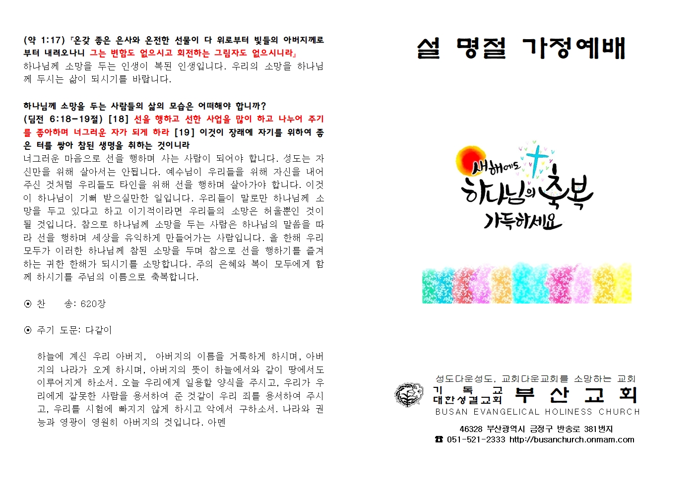 26년 설명절 가정예배서 운영자 2026-02-07 추천 0 댓글 0 조회 36 http://busanchurch.onmam.co.kr/bbs/bbsView/88/6605771 첨부파일 (1) 2026년설명절가정예배서.pdf 0